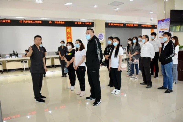 师生们在讲解员的引导下,兴趣盎然地参观了市法院诉讼服务中心、阳光大厅、院史馆、高科技法庭等场所,亲身体验了法院一站式诉讼服务建设成果,知晓了何为跨域立案、网上立案,了解了我市法院发展历程以及市法院开展党史学习教育和队伍教育整顿的经验成果。师生们在宪法墙前拍照留念,并在法庭里坐上审判席、敲响法槌,体验法官职业,了解庭审流程。