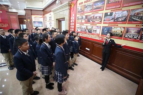 跟随讲解员的步伐,同学们先后参观了党建大厅、领袖故事文化长廊、法官监督墙、图书馆、院史馆和数字图书馆。