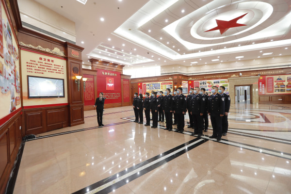 在领袖故事长廊的38块展板前,民警们放慢脚步,认真阅读每一个故事。走进科技法庭,一位民警说:“一定将公平正义牢记心间,为当代中国法治建设实践贡献自己的力量。”在院史馆,民警们敲响警钟,是一锤定音,是警钟长鸣。筑牢思想防线,守住廉政底线,扛起身上的职责和使命,回应群众对安全和公平正义的期盼,不负头顶闪耀的警徽。