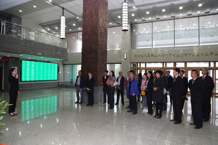 在解说员的引领下,大家依次参观了诉讼服务中心、主楼二楼大厅的德柱、法柱、浮雕和院训,感受到了浓郁的司法文化氛围。解说员详细介绍了浮雕上的“中华人民共和国法官宣誓誓词”和“社会主义核心价值观”等内容,并介绍了中院院训的寓意。