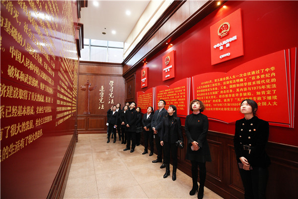 在红色党建大厅,教师们首先回顾了党在长期艰苦卓绝的革命斗争中形成的伟大革命精神,和近几年国家取得的伟大成就,鼓舞振奋人心。走近大厅中间的宪法墙,大家驻足仰望,感受浓厚的法治氛围。