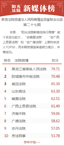 本周,黑龙江高院凭借直播的两场新闻发布会,庭审透明力指数单项分高达89.33,总得分提高了30.54分,排名比上周上升了23名,一举夺得本周冠军。居于"阳光法院新媒体排行周榜"前五位的分别是"@黑龙江省高级人民法院"、"@防城港市中级法院"、"@威远法院"、"@山东高法"和"@峨眉法院"。除"@峨眉法院"外,前十名中还有"@广西上思县法院"和"@广德法院"上期未进TOP50而本期冲榜成功。