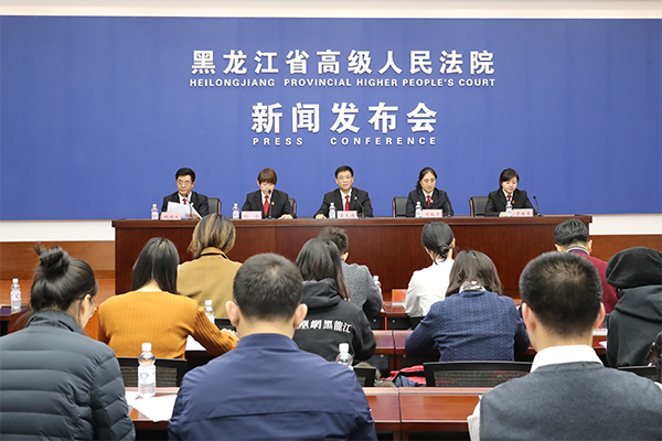 黑龙江高院党组成员、政治部主任、新闻发言人姚绪庆主持发布会,审判委员会专职委员李大伟作主旨发布,民事审判第二庭庭长才桂平、刑事审判第二庭庭长孙冰、审判管理办公室主任于世伟回答记者提问。