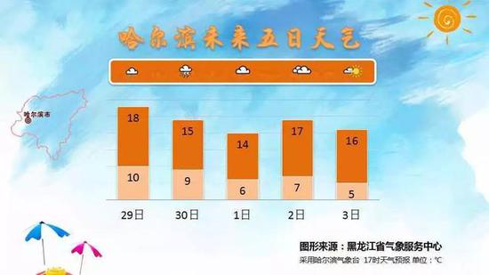 今天白天最高气温:大兴安岭、齐齐哈尔、大庆(15-17)℃,佳木斯、双鸭山、七台河、鸡西、牡丹江(19-21)℃,其他地区(17-19)℃。