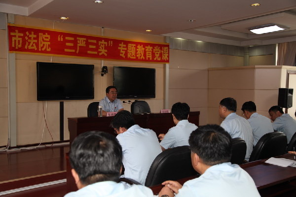 在专题党课上,朱德臣从“为什么要开展三严三实专题教育”、“三严三实的深刻内涵”、及“如何在法院工作中贯彻落实好三严三实具体要求”的三个层面畅谈了“三严三实”专题教育活动开展以来的学习感受。同时要求,要把 “三严三实”专题教育活动的出发点放在为全市经济社会发展健康平稳发展提供优质司法服务的高度和角度来进行,要结合法院实际,从更深的层面上寻求审判工作和市委中心工作的对接点,不断强化法院工作为我市工作大局服务保障的力度。要把“三严三实”专题教育活动的落脚点放在加强法院队伍建设上,重点是加强法院班子建设,不断提升法院领导班子的战斗力、凝聚力、感召力。要把“三严三实”专题教育活动的重点放在公平公正的审判执行案件上,必须把审判执行工作当做法院的头等大事来抓,把公平公正视为法院的生命线,切实履行好法官“司法为民、公正司法”的职责和使命。