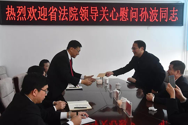 王中明代表高院党组,向孙波致以诚挚的问候和节日的祝福。他指出,孙波同志始终坚持司法为民、公正司法,坚守初心,牢记使命,在罹患重病需要靠透析维持生命的情况下依然工作在审判一线,是新时期人民法官的优秀代表,也是龙江法院的一面鲜明的旗帜,是我们广大干警学习的榜样和楷模。孙波同志的身体健康牵动着全国法院干警的心,希望孙波同志能够保重身体,早日康复,以良好的精神状态投入到工作中。
