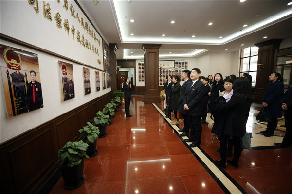 在员额法官监督墙,讲解员告诉大家:“墙上共有163名员额法官,在这里接受人民群众的监督。”