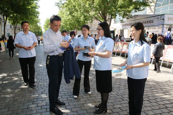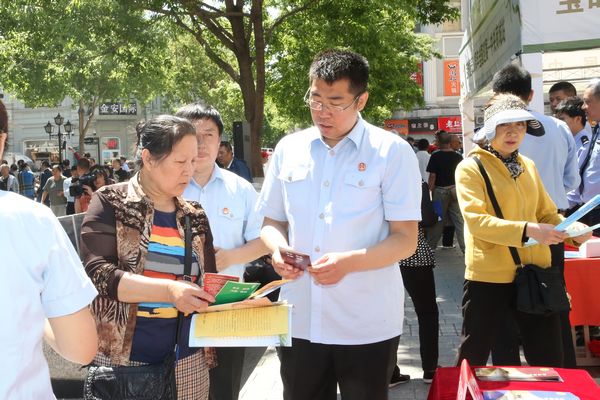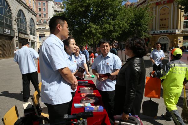 为全面贯彻落实省第十二次党代会精神,大力宣传法治黑龙江、平安黑龙江建设工作成果,按照省委政法委统一安排部署,5月27日上午,省法院副厅级审判员吕爱哲、机关党委专职副书记张锡双带领20余名干警,来到哈尔滨市中央大街,设立宣传展台,集中开展了全省社会综合治理暨平安黑龙江建设集中宣传日活动。