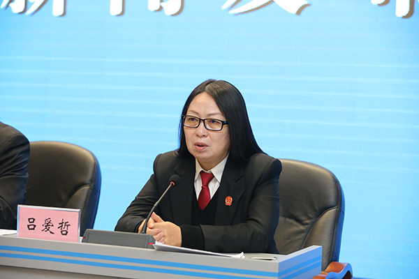 省法院新闻发言人、副厅级审判员吕爱哲主持新闻发布会。 朱丹钰 摄