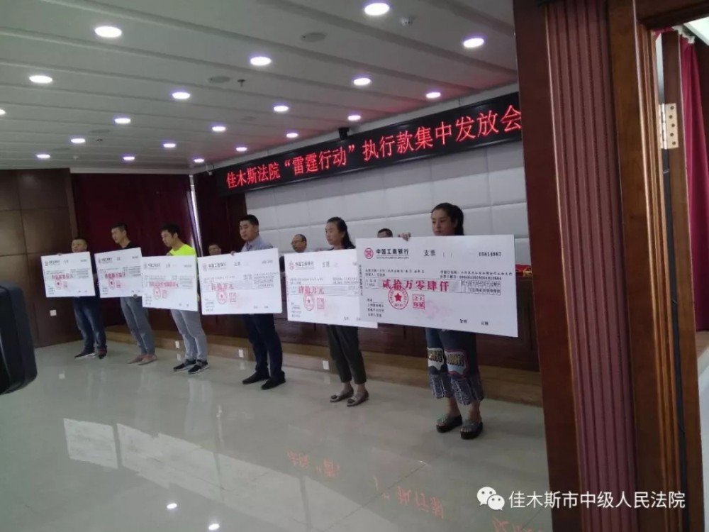6月14日,佳木斯市全市两级法院同步开展“雷霆行动”执行案款发放会,在中院主会场参会的有中级法院、郊区法院、向阳区法院、东风区法院的执行干警及申请执行人,其他县、区法院分别在本院举办案款发放仪式。