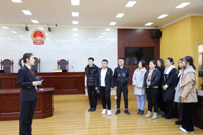 在讲解员的引导下,大学生们观看了主题实践活动展板,了解如何辨别和防范非法集资的相关知识,并参观了立案大厅、诉讼服务中心、法警大队文化长廊、安检岗、图书阅览室、科技法庭。