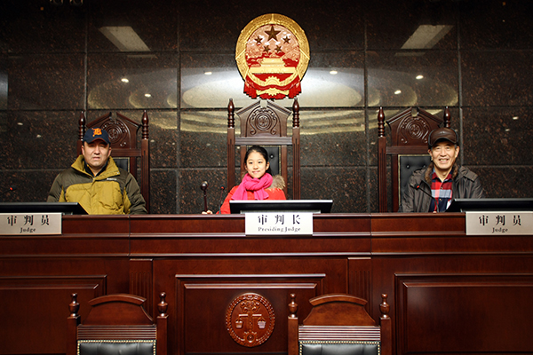 来到科技法庭,大家听说可以坐到法官的位置,都很兴奋。一位坐在审判长位置上的阿姨说“我得保持严肃,法官在办案”,举起法槌,镜头里留下了这一特别的时刻。