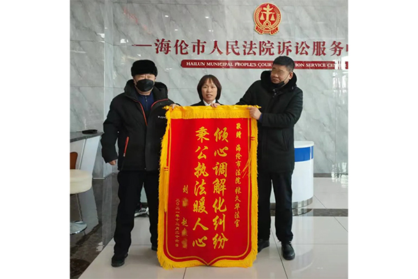 近日,一起案件的双方当事人刘某、赵某来到海伦市法院,将一面书写着“倾心调解化纠纷,秉公执法暖人心”的锦旗赠送给办案法官,字里行间都充满了当事人的感激之情。