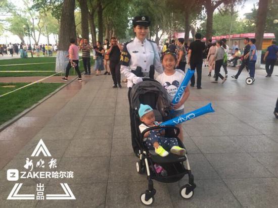 17 日 19 时 10 分,女子巡逻辅警大队南岗中队辅警苏航、顾健美在斯大林公园巡逻时,遇见路边一个婴儿推车无大人看管,车内小男孩啼哭不止,只有车边站着一个小女孩自称是小男孩的姐姐,因人多他们不小心与父母走散了。辅警立即将情况上报大队,同时耐心安慰姐弟俩,并在一旁看管保护两个孩子直至他们的父母找回来。