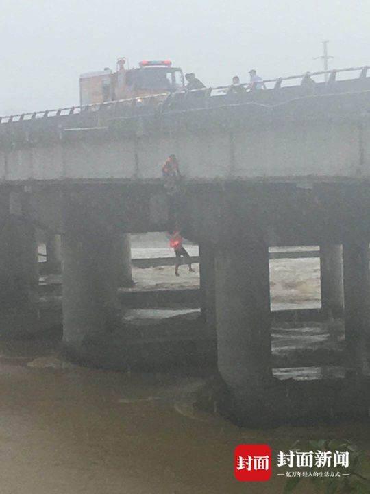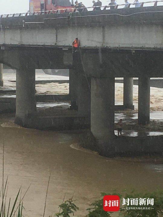 男子钓鱼遇洪水被冲50米爬上桥墩 消防紧急营救