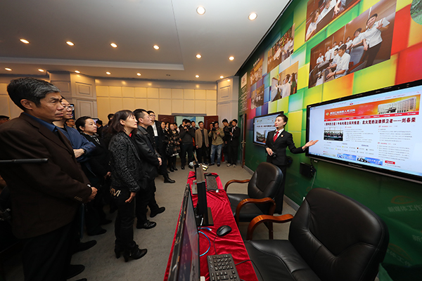 新闻发布厅,是省高院打造的致力于推进司法公开、提升司法公信的新闻发布平台。黑龙江法院运用“互联网+”思维加强司法宣传,坚持用好传统媒体、用足网络媒体、用活新媒体的工作思路得到各位法学院院长及教师们的一致赞同,大家纷纷拿出手机,扫描二维码关注省法院官方微博、微信。通过大屏幕登录《黑龙江法院网》,体验了黑龙江法院一条龙一站式的网上便民服务平台。哈尔滨商业大学法学院副院长高勇说,法院运用“互联网+”思维,直观了解案件管理、执行。新媒体的应用让我感受到司法改革的成果,感受到省高院务实、高效、便民的工作态度。