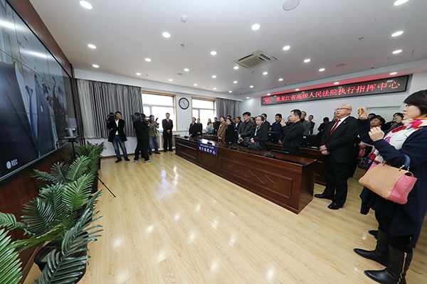 在执行指挥中心,石时态院长现场指挥了一起牡丹江市西安区法院法院正在执行的强制迁出案件。工作人员为各位法学院院长、主任及教师讲解了法院执行案件流程信息管理系统、网络执行查控系统、执行远程指挥监控系统等各自在办理执行案件过程中所起到的作用。各位法学院的院长们都表示通过很多案件的现场执行,让他们看到了更加公开、透明的阳光司法机制。