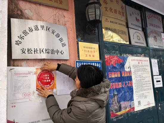 13 日 14 时许,记者将 “ 温暖屋 ” 门贴送到安松社区办公室,心急的社区书记兼主任古蕙若立即带工作人员出门了。“ 先给咱社区大门贴一张,贴上了,环卫工人就知道这里可随时进来取暖、喝热水和休息了。” 古蕙若说,“ 我们安松社区有 7 条主要街路,今年是第二年参加哈尔滨日报发起的‘温暖屋’活动,一定确保每条街上都有‘温暖屋’。”