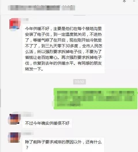今年供暖不好,主要是他们在每个楼地沟里安装了电子伐,到一定温度就关闭,不进热了,等暖气晾了在开启,现在刚开始冷就受不了了,到三九天零下30多度,全市人民怎么活,所以强烈要求拆掉电子伐,不要为了省钱让老百姓寒心。再次强烈要求拆掉电子伐,恢复到去年的供暖水平。有同感的朋友转发一下。