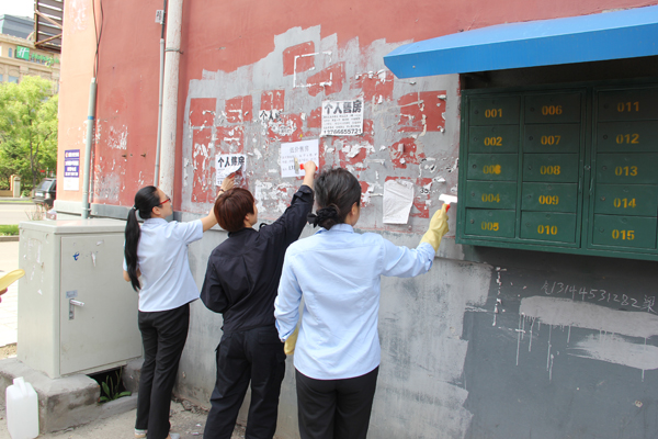 6月10日,牡丹江市爱民区法院党员干警积极参与全市开展的清理非法张贴小广告志愿服务活动,干警们,不怕脏,不怕累,穿梭在居民楼与街道之间,利用小铲子、小刷子、滚筒等清除工具逐个清理了张贴在社区围墙、电线杆、居民楼道里的各式“小广告”,党员们用自己的实际行动为清洁家园、爱护环境,为争创全国文明城市作出了努力,使社区的环境卫生得到了改善,营造了一个文明和谐的居住环境,并得到了居民们的一致好评。此次活动,在树立法院亲民形象的同时,也旨在引导、影响群众树立城市文明从我做起、从小事做起,维护城市文明人人有责的意识。