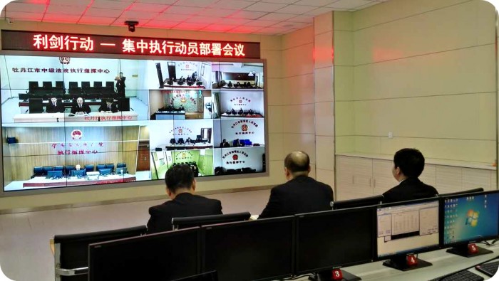 一、利用科技手段,统一指挥,分头行动。本次行动时间定在4月5日到7日。4月5日上午9时,在中院远程指挥室召开集中执行动员会,宣读了集中行动预案,明确了行动时间、行动方式和各项要求,牡丹江中院党组成员、执行局长王菲做动员讲话。此次“利剑行动”最大的特点就是利用信息化手段,由中院执行指挥中心在中院远程指挥室全程统一指挥,各基层法院执行指挥中心则充分发挥职能,对执行行动进行全程监控,随时报告、现场反馈、录像备查。
