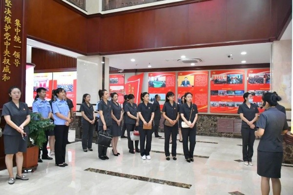 参会人员先后来到法治文化墙、法治浮雕墙、诉讼服务中心、数字化法庭、院史馆、文化长廊、党建大厅等地,观摩牡丹江中院第202次“公众开放日”活动流程。