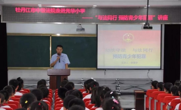 为进一步增强小学生的法制观念,预防和减少青少年违法犯罪,维护和谐校园环境,近日,牡丹江中院与光华小学携手开展“与法同行 预防青少年犯罪”法制教育活动,牡丹江中院刑一庭法官助理李昊宇为200多名小学生上了一堂生动的法制教育课。