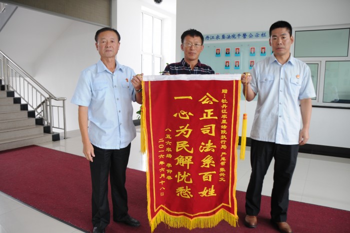 近日,牡丹江农垦法院执行干警不辞辛劳、克服盛夏酷暑,果断积极采取措施,前往广东开展执行工作,顺利执结了一起拖欠十五万元的民间借贷纠纷,化解了当事人埋在心头多年的困扰,并及时解决了当事人2016年生产生活所需的资金,受到当事人由衷的称赞。图为当事人将感谢执行员严忠哲和张兴文的锦旗送到执行人员手中的情景。