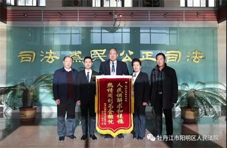 11月22日,牡丹江市锦程物业有限公司为立案庭庭长富淼、人民调解员高广明、张桂英送来了锦旗,感谢法官和人民调解员坚持不懈调解,终于与业主达成和解协议。