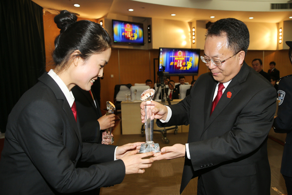 省法院党组副书记、常务副院长王树江为获得一等奖选手颁奖。朱丹钰 摄