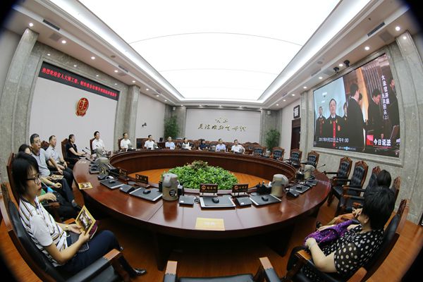 在审委会会议室,大家围着圆桌而坐,观看了中央电视台《今日说法》大法官开庭专题片。参观结束后,省法院信息化建设情况以及公众开放日活动丰富的参观流程受到省人大领导们的一致好评,表示将继续关注并大力支持法院工作。