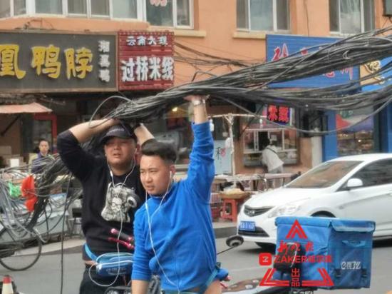 18 时许,记者联络到 “ 支 ” 线缆的外卖小哥白振华。他说,当天 12 时 30 分许,他送餐途中经过此地时,发现垂落的成捆线缆悬在半空中,给来往车辆造成不便。他下车用手举了一会儿,考虑到送餐有时间限制,便又离开了。