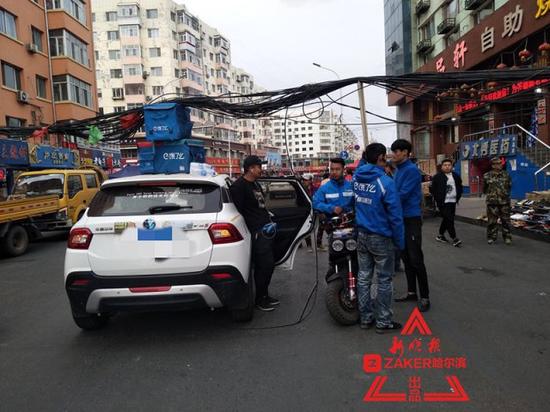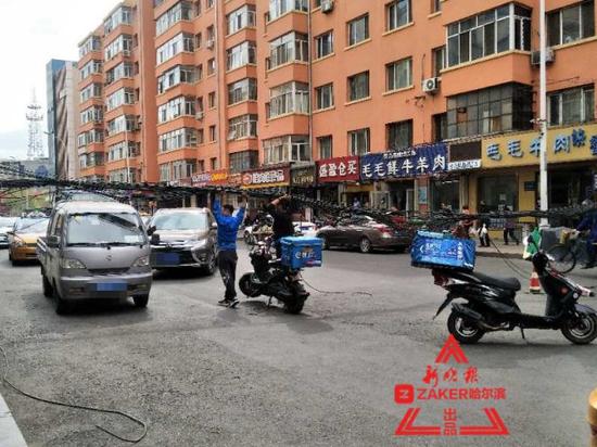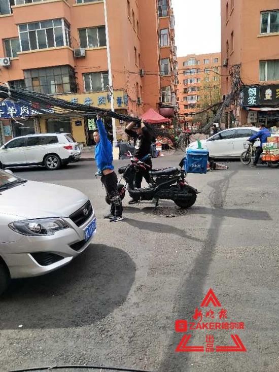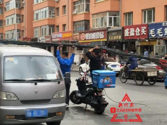 当天 17 时许,记者联系到徐女士。徐女士介绍,14 时许,她途经道外区草市街与大水晶街交口时发现,马路中央有两名男子撑着一捆垂落的线缆。一开始她还以为是普通维修,一打听才知道,两人是为了方便大家通行在现场帮忙的,而且两人已经举了两个小时。附近还有送外卖的车辆,他们都是从事送餐工作的人员。