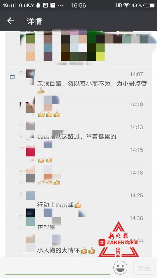 “ 正能量 ”“ 平凡中出伟大!”“ 为送餐小哥点赞,心中有大爱!”…… 在这条状态下方,有多位微友留言点赞两位小哥的暖心之举,还有人原文转发,传递正能量。
