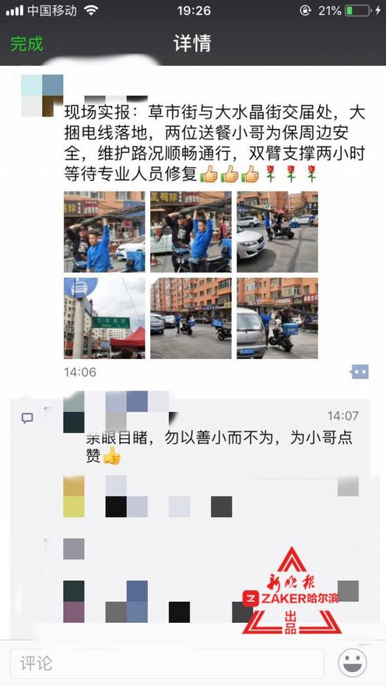 “ 看起来年龄都不太大,线很粗,他们个子也不是很高,肯定很累。” 徐女士说,附近就是市场,车流量不小,这样的举动感动了很多人,还有路过的司机朋友也停下来,帮忙举一会儿。一位老人还说:“ 这样的行为真应该点赞,你们年轻人发个朋友圈,点赞一下正能量。” 于是,就有了徐女士图文并茂的 “ 朋友圈 ”。徐女士说,两位小哥告诉她,已经拨打了报修电话。