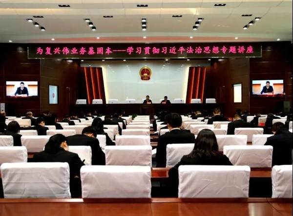 张裕䘵以《为民族复兴夯基固本---学习贯彻习近平法治思想》为题,从习近平法治思想的基本精神和核心要义、为什么全面依法治国、怎样全面依法治国三个方面进行了深入浅出的讲解,并结合法院工作实际,提出了学习贯彻落实习近平法治思想的建设性意见。