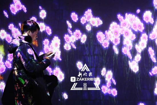 展馆工作人员介绍,“ 花涧追光 ” 通过电脑系统完成实时描绘,会根据观赏者举止行为的变化而变化,实现 “ 全方位沉浸式 ” 艺术体验效果。