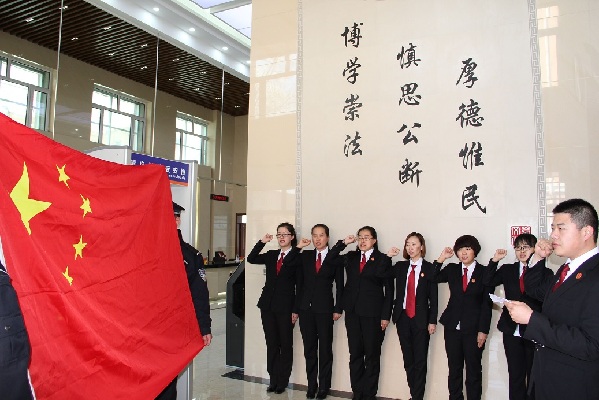 4月27日,七台河市茄子河区人民法院组织新入职人员宣誓仪式,站在“博学崇法、慎思公断、厚德唯民”的院训前,六名新录用公务员身穿统一法服并排站立,在领誓人的带领、监誓人的监督下,伴随着国歌,面向国旗,右手举拳,完成了庄严又隆重的入职宣誓仪式。