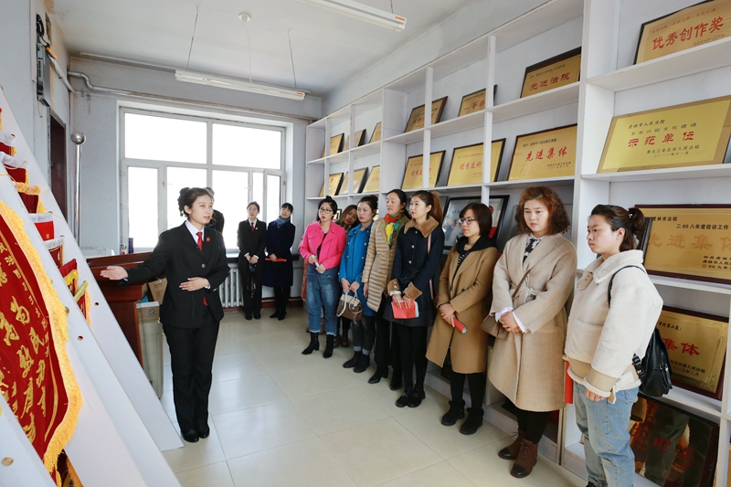 在荣誉室,女干部们参观一面面奖牌、锦旗、一座座奖杯、一本本证书,通过讲解员的介绍,了解虎林法院近年来所获得的荣誉,对法院工作取得的成绩表示赞赏。