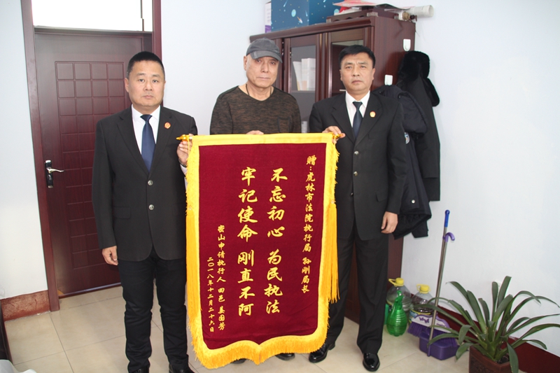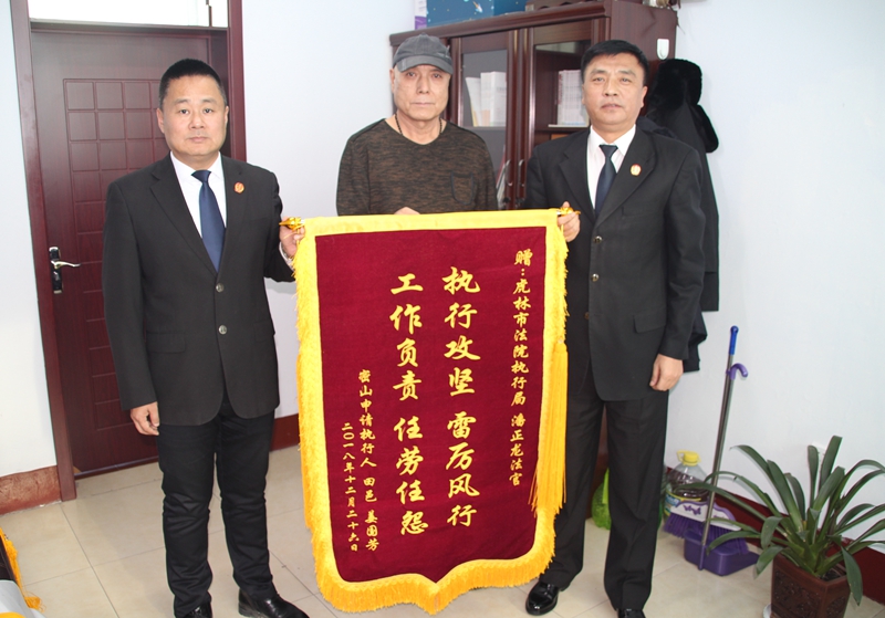 一元初始,万象更新。新年上班第二天,虎林法院收到一份特殊的礼物——锦旗和感谢信。1月3日,案件申请执行人田某一大早从密山驱车来到虎林法院执行局孙刚局长办公室,送来两面锦旗和两封感谢信。两面锦旗,一面是送给孙刚局长的,锦旗上写着“不忘初心 为民执法 牢记使命 刚正不阿”,一面是送给执行干警潘正隆的,锦旗上写着“执行攻坚 雷厉风行 工作负责 任劳任怨”。两封感谢信中书写着执行局局长和执行干警为维护申请执行人合法权益所付出的辛苦和努力,字里行间透露出申请执行人对虎林法院由衷的感谢和崇高的敬意。