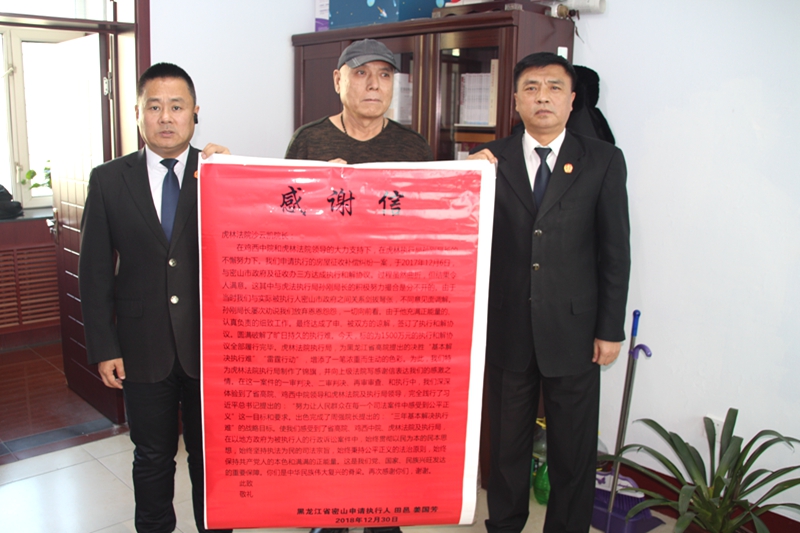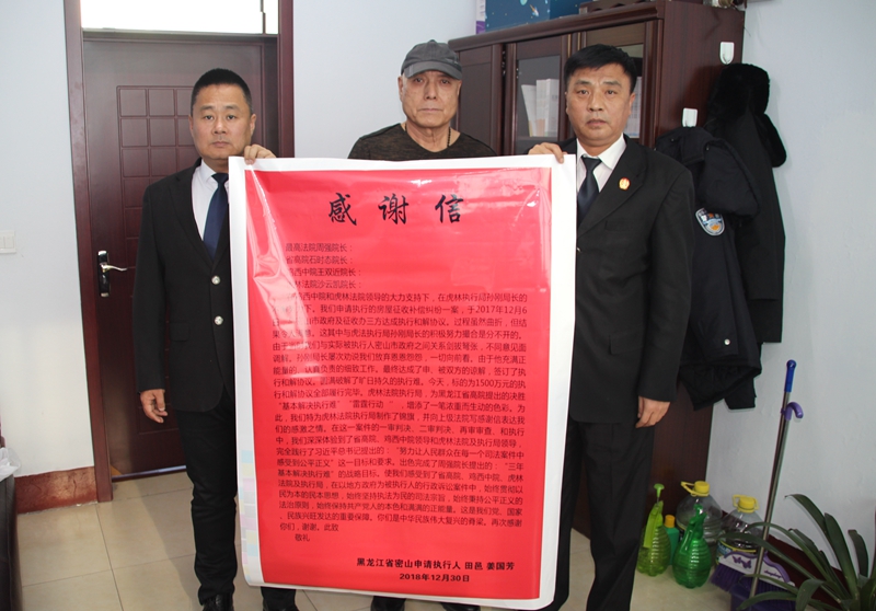 最终,在鸡西中院与虎林法院两级法院的大力支持下,在虎林法院执行局孙刚局长和执行干警的不懈努力下,在密山市有关领导的组织配合下,案件达成分期还款执行和解协议。截止目前,1500万元欠款全部给付完毕。