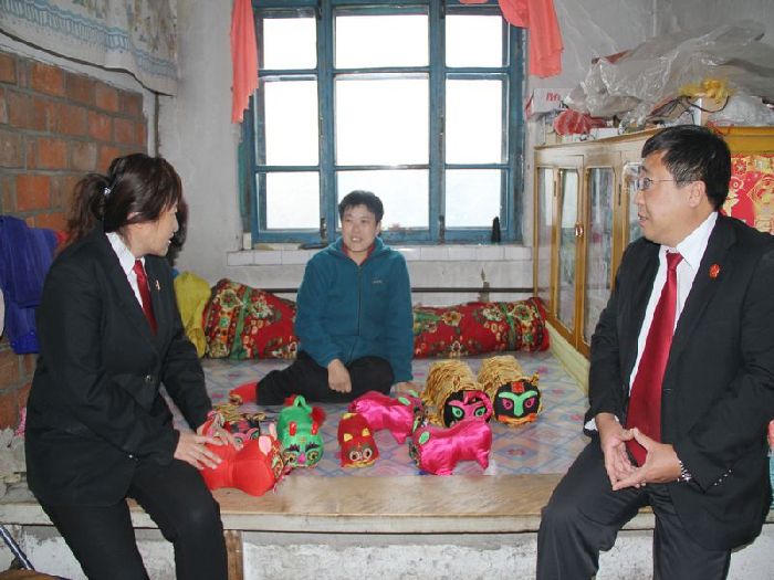 众人把带来的大米、水果等慰问品放在地上,便进了里屋。夏大姐正坐在炕上缝老虎呢。一见到法院的同志来了,便欣喜的招呼他们坐下。孙主任和王法官亲切的问候了夏大姐最近的情况,表达了虎林法院全体在职党员对她的关心,并表示若是有困难就与他们联系,他们一定会全力以赴的帮忙。夏大姐笑容满面的感谢,并乐观地讲述起她的生活和她的老虎枕头。在聊天里了解了夏大姐的近况后,一行人提出了告辞,王法官拿出了慰问金,并说道,“希望这钱能够给你们添置些冬天用的器物,暖暖和和的度过这个冬天。”