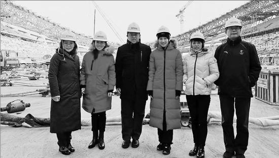 北京冬奥组委运动员委员会一行考察建设中的北京冬奥会速滑馆。左一王冰玉,左二杨扬,右三张虹。 照片由受访者提供