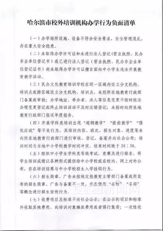 原标题:哈市出台“负面清单”十三条|专治校外培训机构办学违规行为