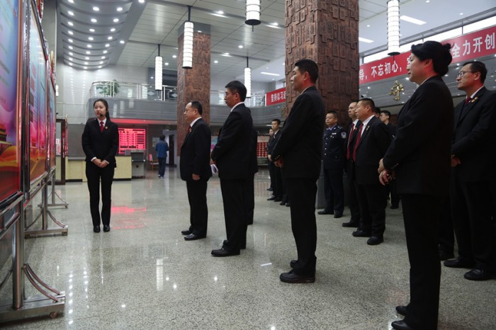 二楼大厅电子屏上滚动播放着:“砥砺前行踏上新征程 为民司法再创新辉煌;深入学习贯彻党的十九大精神,努力让人民群众在每一个司法案件中感受到公平和正义。”等宣传标语,为干警营造了鲜活的文化氛围。