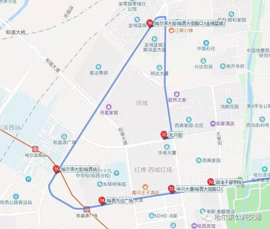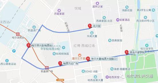 增设 “哈尔滨大街(哈西大街路口)(金域蓝城)“站、“北兴街”站, 取消 “西典家园”站、“鸿朗花园”站。
