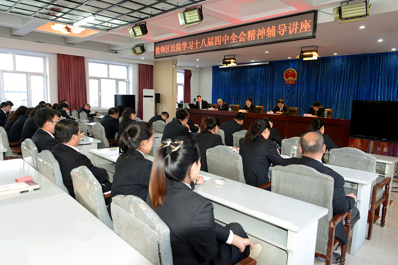 12月9日下午,齐齐哈尔市铁锋区人民法院以专题辅导讲座的形式,进一步动员部署学习贯彻党的十八届四中全会精神,要求全院干警紧密联系工作实际,迅速掀起学习贯彻四中全会精神热潮,以实际行动推进法治中国建设、促进法院工作科学发展。讲座由党组成员、政工科长邵宇主持,党组成员及全院干警悉数参加。