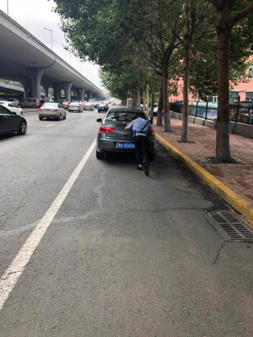 车辆没油 哈尔滨辅警推车1公里到加油站