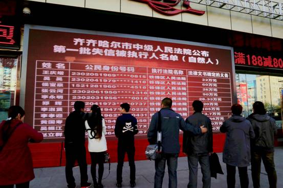 从9月末以来,法院主动协调市电视台、《齐齐哈尔日报》、《鹤城晚报》等多家新闻媒体及城市中心地带、大型商场等大型视频媒体平台,首批公布、曝光了112名失信被执行人名单信息(其中自然人102人,法人单位10个),曝光其失信行为,敦促履行法定义务。市电视台在综合频道、影视频道、法制新闻等多个频道和栏目予以播发,《齐齐哈尔日报》、《鹤城晚报》以整版篇幅予以刊载,市百货大楼通过临街大型LED电子显示屏,将失信被执行人名单进行滚动播出,对失信被执行人形成全面围堵的高压态势。中院执行局还同时发布《关于敦促被执行人主动履行义务的公告》,敦促失信被执行人主动履行法定义务。广大市民群众对法院公布、曝光失信被执行人的做法拍手称快,纷纷表示支持曝光失信行为,对破坏社会诚信的“老赖”就应该大力惩戒,维护诚信鹤城的良好形象。