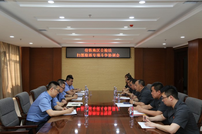 为深入推进扫黑除恶专项斗争工作,佳木斯铁路运输法院协调公安处、检察院共同召开佳铁地区公检法扫黑除恶专项斗争工作协调会议。佳木斯铁路运输法院副院长唐永杰主持会议,检察院副检察长王猛、公安处法制支队长张智国出席会议。
